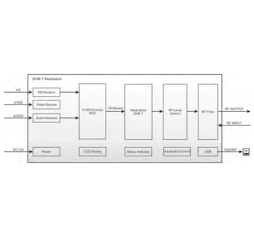 Single input modulator that converts analogue A/V source to a ISDB-T/DVB-C/DVB-T channel